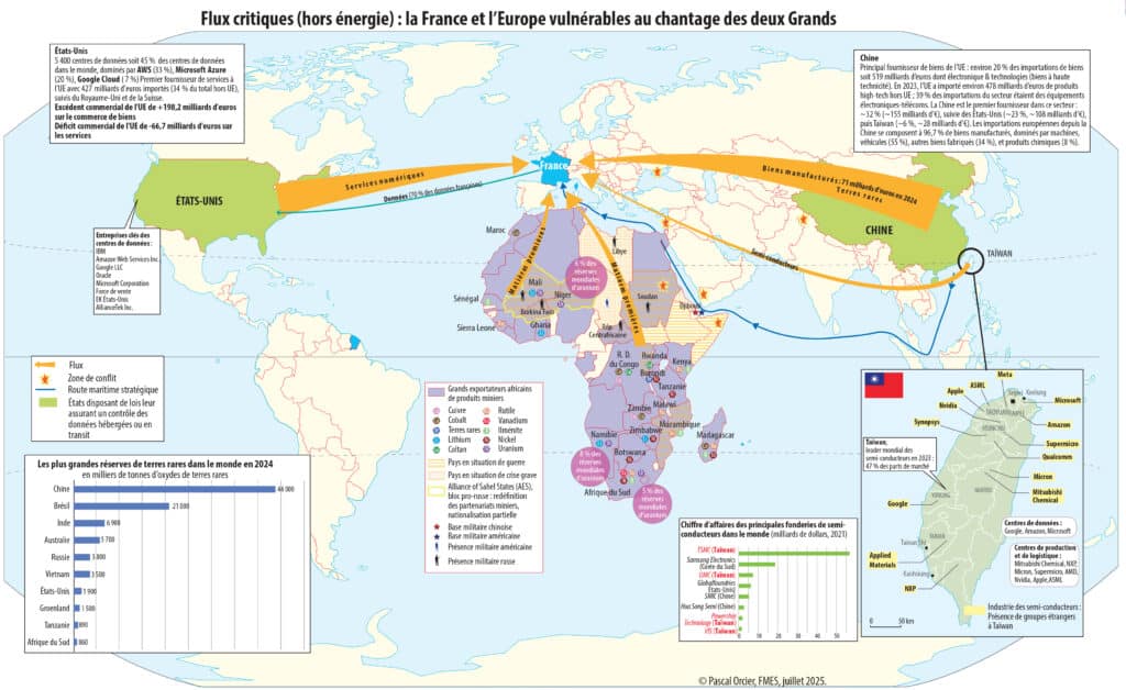 Ces interdépendances exposent la France, l’Europe et leurs acteurs économiques à des risques accrus en cas de tensions géopolitiques ou commerciales, notamment avec les deux grandes puissances que sont la Chine et les États-Unis. Le risque serait bien évidemment accru en cas d’escalade, voire de confrontation directe entre Washington et Pékin, notamment sur la question de Taïwan ou des Corées, d’autant plus que les Etats-Unis comme la Chine restent des marchés attractifs pour les Européens. Cette situation souligne l’urgence pour la France, comme pour l’Union européenne, de diversifier leurs sources d’approvisionnement en ressources stratégiques.