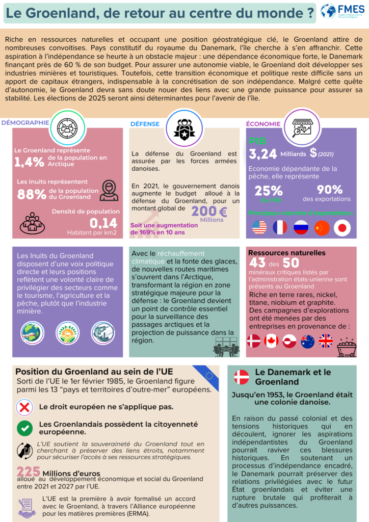 Avec la fonte des glaces, le Groenland contrôle de nouvelles routes maritimes et concentre des ressources naturelles critiques. Sa position en fait un territoire clé pour la surveillance et la défense, au centre des rivalités entre États-Unis, Russie et Chine.
