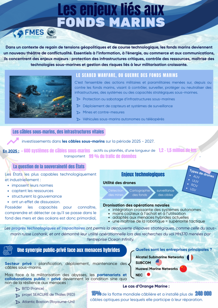 Face à ces dynamiques, l’Observatoire dédié à la maîtrise des fonds marins, créé par le ministère des Armées et piloté par l’Institut FMES, a mené une réflexion sur ces différents enjeux.