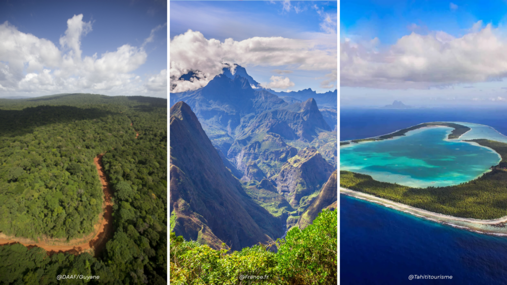 La diversité géographique des outre-mer : la forêt guyanaise, le relief réunionnais et les atolls polynésiens.