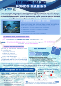 L’observatoire Maîtrise des fonds marins fait partie du système d’appui à la recherche stratégique mis en place par la Direction générale des Relations internationales (DGRIS) pour le Ministère des Armées. Les fonds marins sont désormais un espace stratégique majeur, marqué par une intensification des rivalités entre grandes puissances et par la multiplication de menaces hybrides difficiles à attribuer. À la fois zones de développement économique et nouveaux champs de conflictualité comparables au cyberespace, ils concentrent des enjeux critiques de souveraineté, de sécurité et de liberté d’action militaire. Dans ce contexte, l’Observatoire Maîtrise des fonds marins s’inscrit comme un outil stratégique destiné à mieux comprendre, anticiper et structurer la réflexion sur ces dynamiques émergentes.