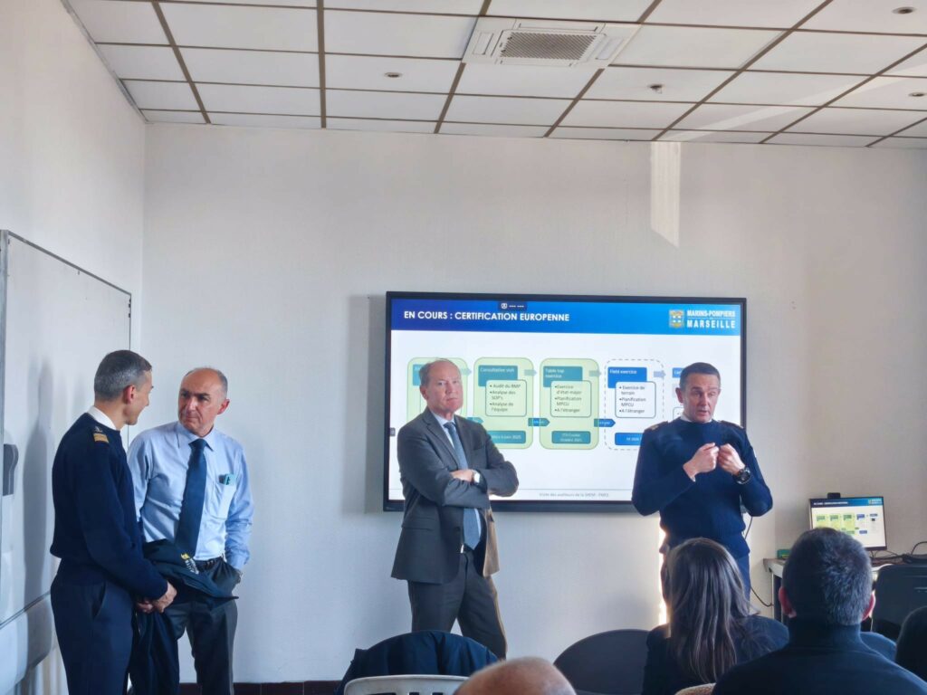 Poursuivant sur la thématique de l’action de l’Etat en mer, les auditeurs ont ensuite été reçus au bataillon des marins pompiers de Marseille (BMPM) par le capitaine de vaisseau Nicolas Pitrat, commandant en second du bataillon.