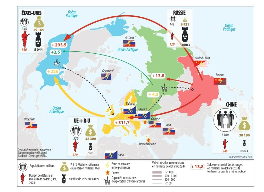 Les équilibres entre ces quatre pôles de puissance varient selon la dimension concernée. D’un point de vue commercial, l’Europe est dépendante de la Chine, et les États-Unis de l’Europe. Concernant la démographie, la Chine est loin devant et l’Europe devance les deux autres puissances. Dans le domaine des forces armées, les États-Unis dominent clairement. Si les quatre blocs disposent d’armes nucléaires, la Russie et les États-Unis gardent une avance considérable. Par ailleurs, deux blocs exportent de l’énergie (États-Unis et Russie) et deux en consomment énormément (Europe et Chine). Ces puissances sont toutes en tension les unes avec les autres, sauf la Russie et la Chine. Point particulier, l’Europe fait face à des tensions sur tous ses flancs (Est, Sud, Ouest et Nord).