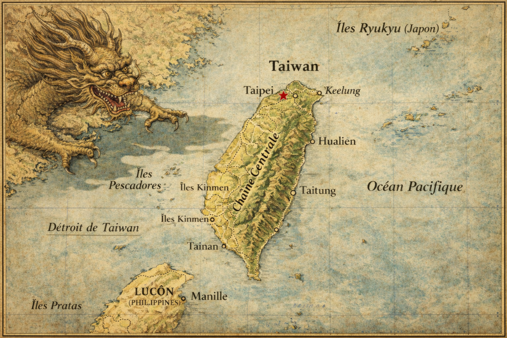 [1] Jusqu’à l’installation d’un comptoir européen au XVIème siècle, l’île n’est qu’un satellite sans réelle intégration à la structure politique chinoise territoriale. Les Japonais semblent davantage s’y intéresser pour étendre leurs possessions en Asie. Un loyaliste Ming vient finalement s’y établir en 1661 pour s’en servir de base arrière afin de renverser les Mandchous installés sur le continent.